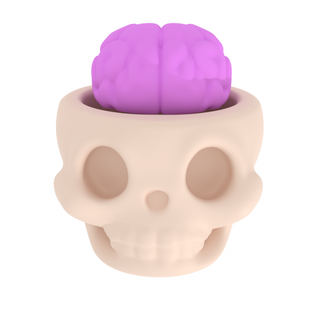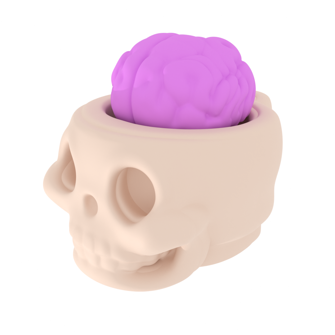 آویز جمجمه (سفید) با مغز (صورتی) لرزان و متحرک دارای رابط فنری شکل. در ابعاد 24x29x27 میلی متر.